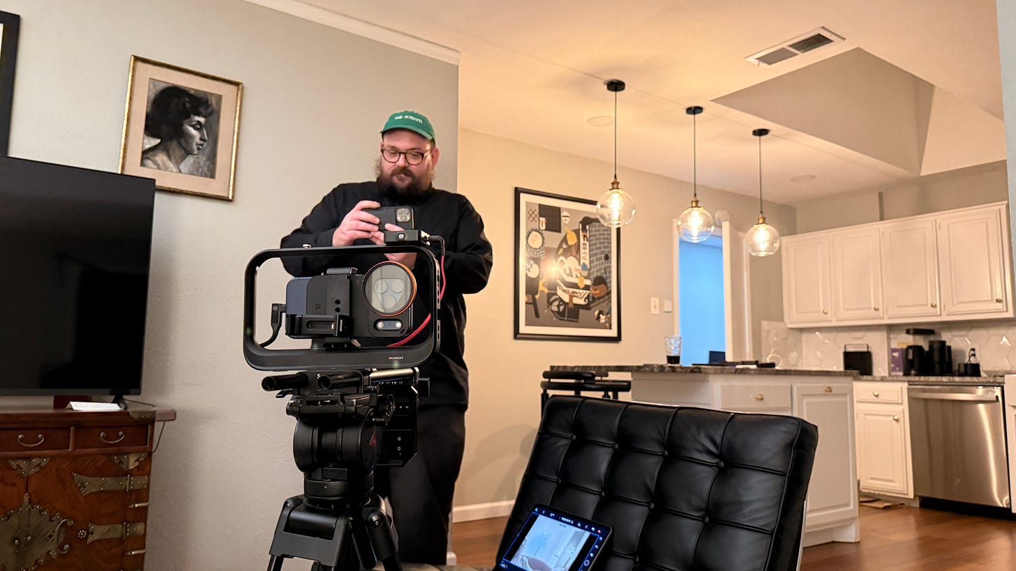 I think there is this idea that good art has to be hard or at least HEAVY. Now I don’t intend to dismiss the rigor of making cinema, which historically has long days, exhaustive ideations and weighty equipment but what if we imagined a world in which we could actually make beautiful things with more intentional ease? Less burden on our backs? But with the same cinematic backbone of our mentors. We want to make beautiful films, yes, but let’s face it, we don’t have A24 money (We can say that now!) and we LOVE Hong Sang-Soo, so we aspire to make things beautiful but in a simplified way. Now I’ve utilized the Iphone in many of my projects, especially the hybrid-meta ones like Ex Ex Ex and Ice Saints but in the context of a persona camera or something with a distinct self-pov. It creates a sort of digital-social cinematic language that we recognize as modern. Now this idea of shooting an entire film in a formal way, using an iphone camera attached to a moment super cage and being monitored and operated remotely from an Ipad using the blackmagic camera app, was very exciting. The burden of gear was suddenly erased by tech we are mostly already using on a daily basis. It’s such a simple set-up, that we could take it out into the world without causing a whole lot of extra attention…”stealing” shots became as easy as capturing daily life but shot in log with Apple Pro HQ in 4:3 Open Gate. Suddenly everywhere we looked, we saw CINEMA.